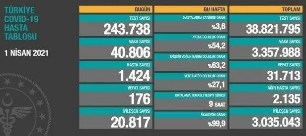 Ağır hasta 3 bin 375 oldu, 55 bin 592 kişinin Kovid-19 tedavisinin/karantinasının sona ermesiyle iyileşen sayısı 3 milyon 792 bin 129'a yükseldi.