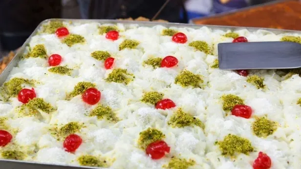 İçerisine 2 yemek kaşığı gül suyu ekleyip tatlının üzerine gezdirelim.