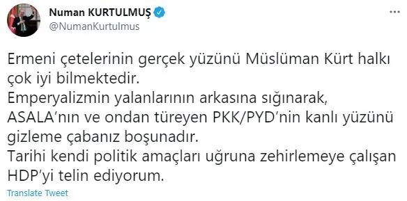 AK Parti Genel Başkanvekili Numan Kurtulmuş ise duruma "Ermeni çetelerinin gerçek yüzünü Müslüman Kürt halkı çok iyi bilmektedir. Emperyalizmin yalanlarının arkasına sığınarak, ASALA'nın ve ondan türeyen PKK/PYD'nin kanlı yüzünü gizleme çabanız boşunadır. Tarihi kendi politik amaçları uğruna zehirlemeye çalışan HDP'yi telin ediyorum." sözleriyle tepki gösterdi.