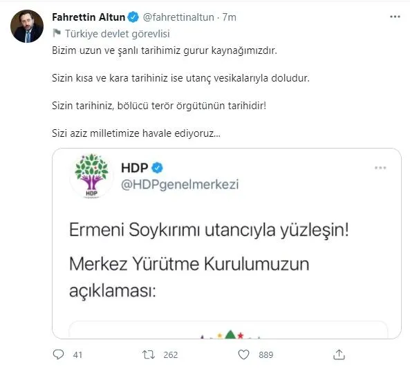 İletişim Başkanı Fahrettin Altun, söz konusu bildiriye sosyal medya hesabından tepki gösterdi. Altun, mesajında "Bizim uzun ve şanlı tarihimiz gurur kaynağımızdır. Sizin kısa ve kara tarihiniz ise utanç vesikalarıyla doludur. Sizin tarihiniz, bölücü terör örgütünün tarihidir! Sizi aziz milletimize havale ediyoruz..." ifadelerini kullandı.