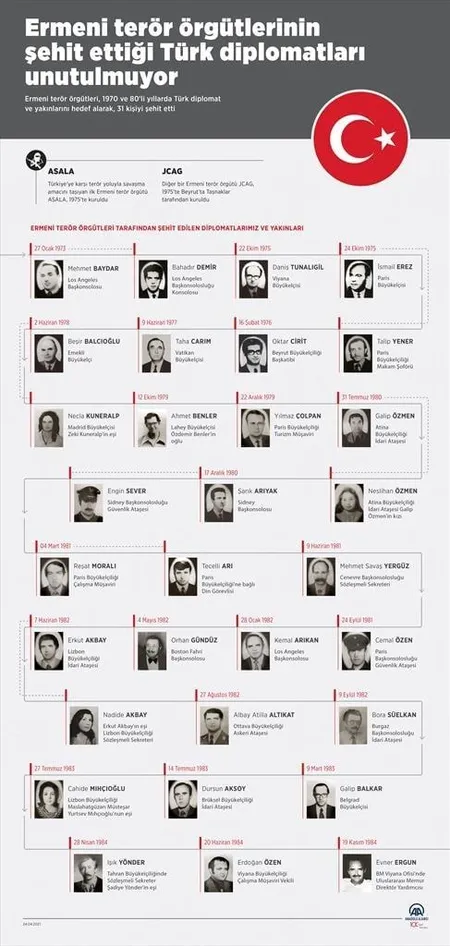 Dışişleri Bakanlığı'nca Ermeni terörü saldırılarında şehit olan diplomatların isimleri paylaşılarak, "Ermeni terörünün şehit ettiği mesai arkadaşlarımızı unutmadık, asla unutmayacağız" denildi.