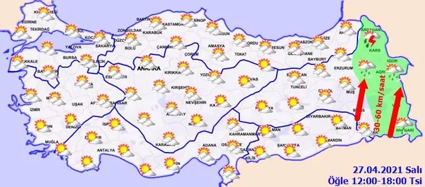 Meteorolojiden hava durumuyla ilgili son dakika uyarıları gelmeye devam ediyor. Yapılan son değerlendirmelere göre, ülkemizin kuzey, iç ve doğu kesimlerinin parçalı bulutlu, Doğu Anadolu'nun doğusu ile ilk saatlerde Trabzon çevrelerinin kısa süreli ve yerel olmak üzere sağanak ve gök gürültülü sağanak yağışlı, diğer yerlerin az bulutlu ve açık geçeceği tahmin ediliyor. Hava sıcaklığı iç ve batı bölgelerde 2 ila 6 derece artacağı, diğer yerlerde önemli bir değişiklik olmayacağı tahmin ediliyor. İşte il il 27 Nisan hava durumu raporu.