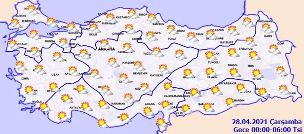 Meteoroloji Genel Müdürlüğü tarafından yapılan son değerlendirmelere göre, ülkemizin kuzey, iç ve doğu kesimlerinin parçalı bulutlu, Doğu Anadolu'nun doğusu ile ilk saatlerde Trabzon çevrelerinin kısa süreli ve yerel olmak üzere sağanak ve gök gürültülü sağanak yağışlı, diğer yerlerin az bulutlu ve açık geçeceği tahmin ediliyor. Hava sıcaklığı iç ve batı bölgelerde 2 ila 6 derece artacağı, diğer yerlerde önemli bir değişiklik olmayacağı tahmin ediliyor. Rüzgarın ülkemizin batısında kuzey ve kuzeydoğu yönlerden, doğusunda güney yönlerden hafif, ara sıra orta kuvvette; Doğu Anadolu'nun güneydoğusunda yer yer kuvvetli (30-60 km/sa) olarak esmesi bekleniyor.