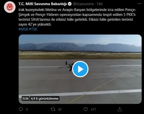 MSB'den yapılan açıklamada, "Irak'ın kuzeyindeki Metina ve Avaşin-Basyan bölgelerinde icra edilen Pençe-Şimşek ve Pençe-Yıldırım operasyonları kapsamında tespit edilen 5 PKK'lı terörist SİHA'larımız ile etkisiz hale getirildi. Etkisiz hale getirilen terörist sayısı 42'ye yükseldi." ifadeleri kullanıldı.