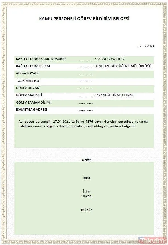 Kamu kurum ve kuruluşlarında görevli kamu personeli için yetkili yönetici tarafından "Kamu Personeli Görev Bildirim Belgesi" düzenlenecek. Bu kapsamdaki kamu personeli, görevli olduğu zaman dilimi içerisinde ikameti ile işyeri arasındaki güzergâhla sınırlı olacak şekilde muafiyete tabi olacak.