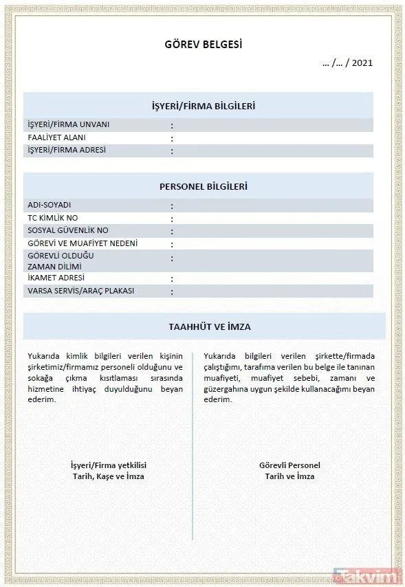 Manuel düzenlenen görev belgelerinde sokağa çıkma kısıtlaması sırasında zorunlu bir amaçla işyerinde olması gerektiği bilgisinin doğruluğundan firma, işyeri sorumlu olacak.