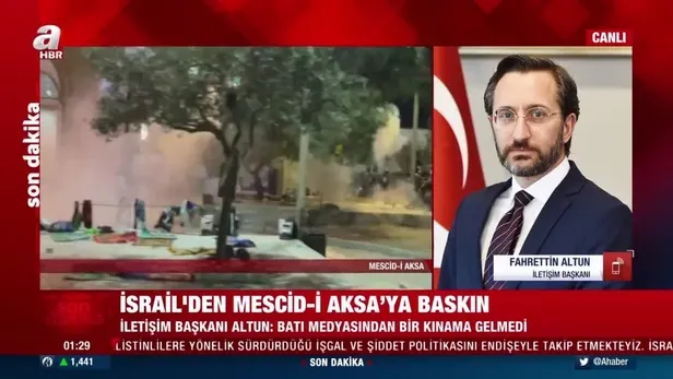 Cumhurbaşkanlığı İletişim Başkanı Fahrettin Altun, Müslümanların ilk kıblesi Mescid-i Aksa'ya saldıran siyonist terör devleti İsrail'e A Haber canlı yayınında çok sert tepki gösterdi. İslam dünyasının bu zulüm düzenine karşı çıkması gerektiğini söyleyen Altun, ucuz bir takım yönlendirmelerle Filistin davasından vazgeçmeyeceklerini ifade etti. İletişim Başkanı, "Türkiye'nin gücü olmasaydı çok daha ağır zulümler olurdu" şeklinde konuştu.