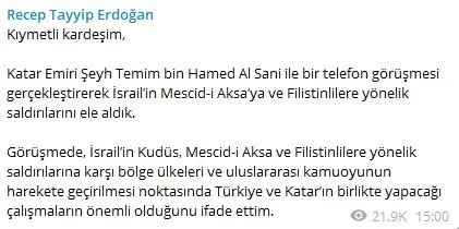 Cumhurbaşkanlığı İletişim Başkanlığından yapılan açıklamaya göre, görüşmede, İsrail'in Mescid-i Aksa'ya ve Filistinlilere yönelik saldırıları ele alındı.