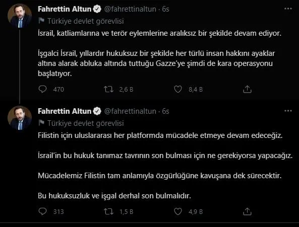 Fahrettin Altun: İsrail, katliamlarına ve terör eylemlerine aralıksız bir şekilde devam ediyor. İşgalci İsrail, yıllardır hukuksuz bir şekilde her türlü insan hakkını ayaklar altına alarak abluka altında tuttuğu Gazze'ye şimdi de kara operasyonu başlatıyor.