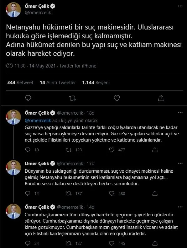 Çelik, Twitter hesabından İsrail'in Gazze'ye yönelik saldırılarına ilişkin paylaşımda bulundu.