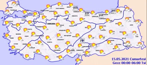 Meteoroloji Genel Müdürlüğü tarafından yapılan son değerlendirmelere göre: Doğu Anadolu'nun doğusu ile zamanla Marmara'nın Trakya kesiminin parçalı yer yer çok bulutlu, Iğdır'ın güneyi, Ağrı'nın ve Van'ın doğusu ile Kırklareli, Edirne ve Hakkari çevrelerinin yerel olmak üzere sağanak ve gök gürültülü sağanak yağışlı, diğer yerlerin az bulutlu ve açık geçeceği tahmin ediliyor. Sabah saatlerinde Doğu Akdeniz'de, Orta ve Doğu Karadeniz kıyılarında yer yer sis ve pus hadisesi bekleniyor.