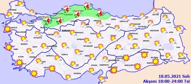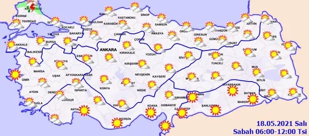 Meteoroloji Genel Müdürlüğü tarafından yapılan son değerlendirmelere göre ülkemizin kuzey, iç ve doğu kesimlerinin parçalı bulutlu; Marmara'nın kuzey ve doğusu, Batı Karadeniz, Doğu Anadolu'nun kuzeydoğusu ile Samsun il geneli ve Rize, Artvin illerinin iç kesimlerinin yer yer çok bulutlu sağanak ve gök gürültülü sağanak yağışlı, diğer yerlerin az bulutlu ve açık geçeceği tahmin ediliyor. Yurt genelinde mevsim normallerinin üzerinde seyretmekte olan sıcaklıkların artmaya devam etmesi bekleniyor. Rüzgarın ise genellikle güneybatı ve batılı yönlerden hafif, ara sıra orta kuvvette, Doğu Anadolu'nun doğu ve güneydoğusunda yer yer kuvvetli (30-60 km/sa) eseceği tahmin ediliyor.