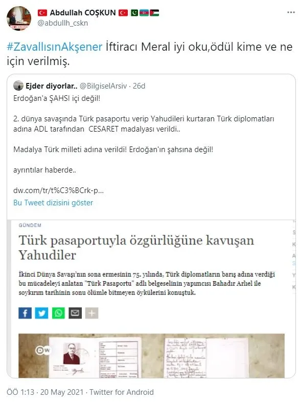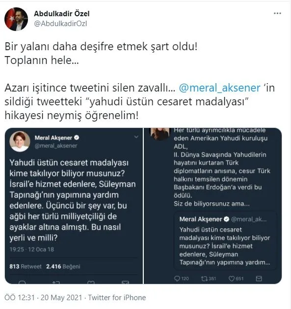 Bu kez de 'Yahudi cesaret madalyası' yalanına sarılan ve algı operasyonu yaparak tweet atan Akşener, "Sayın Erdoğan, Zavallılık, gideceğim diye atıp tutup, 8 yıldır Gazze'ye gidememektir. Zavallılık, İsrail'e esip gürleyip, Çin'e karşı boyun bükmektir. Zavallılık, siyonist madalyasını boynunda gururla taşımaktır. Gerçek zavallılık, gerekeni yapamayıp sürekli boş konuşmaktır." şeklinde skandal ifadelerle asılsız iddialarda bulundu.