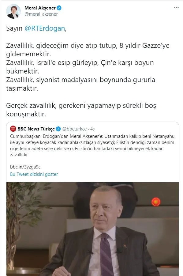 Erdoğan Akşener'e "Filistin dendiği zaman benim ciğerlerim adeta sese gelir ve o, Filistin'in haritadaki yerini bilmeyecek kadar zavallıdır." ifadeleriyle yanıt verdi.