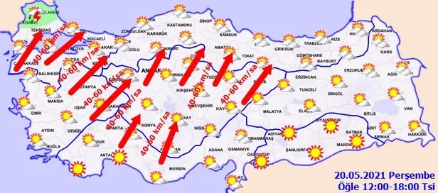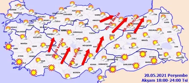 Genellikle güney ve güneybatı yönlerden hafif, ara sıra orta kuvvette, Marmara, İç Ege, Batı Akdeniz'in iç kesimleri ile İç Anadolu'da kuvvetli (40-60 km/sa), akşam saatlerinden sonra Orta Karadeniz kıyıları ile Doğu Karadeniz'de kuvvetli ve yer yer fırtına şeklinde (50-80 km/sa) esmesi bekleniyor.