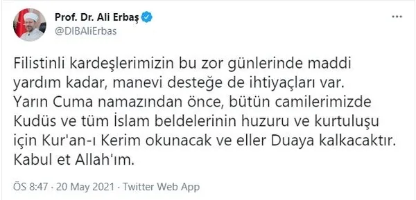 "Filistinli kardeşlerimizin bu zor günlerinde maddi yardım kadar, manevi desteğe de ihtiyaçları var. Yarın Cuma namazından önce, bütün camilerimizde Kudüs ve tüm İslam beldelerinin huzuru ve kurtuluşu için Kur'an-ı Kerim okunacak ve eller Duaya kalkacaktır. Kabul et Allah'ım."