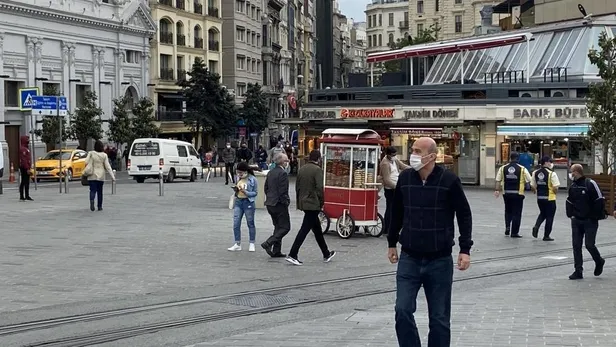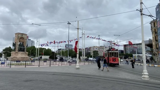 Taksim Meydanı'nda etkili olan şiddetli rüzgar nedeniyle vatandaşlar yürümekte zorluk çekerken, bayrakların koparcasına sallandıkları görüntülendi.