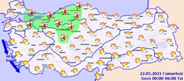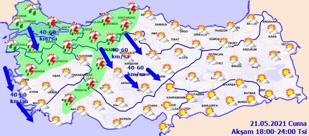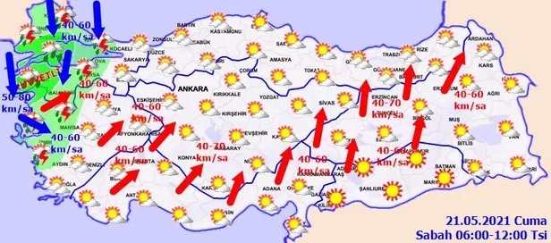 Marmara ve Kuzey Ege kıyılarında kuzey yönlerden kuvvetli ve yer yer kısa süreli fırtına (40-80 km/sa), İç Ege, Göller Yöresi, İç Anadolu'nun güney ve doğusu, Doğu Anadolu'nun kuzey ve batısı, Doğu Karadeniz'in iç kesimlerinde güney ve güneybatı yönlerden kuvvetli ve yer yer kısa süreli fırtına (40-80 km/sa) şeklinde esmesi bekleniyor.