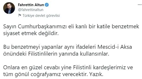 İletişim Başkanı Fahrettin Altun, İP Genel Başkanı Meral Akşener'in düzeysiz benzetmesine tepki gösteren isimlerden oldu. Altun yaptığı paylaşımda, "Sayın Cumhurbaşkanımızı eli kanlı bir katile benzetmek siyaset etmek değildir. Bu benzetmeyi yapanlar aynı ifadeleri Mescid-i Aksa önündeki Filistinlilerin yanında kullansınlar. Onlara en güzel cevabı yine Filistinli kardeşlerimiz ve tüm gönül coğrafyamız verecektir. Yazık." açıklamalarında bulundu.