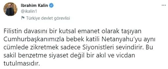 İP Genel Başkanı Meral Akşener'in Başkan Erdoğan'ı bebek katili Netanyahu'ya benzetmesine bir tepki de Cumhurbaşkanlığı Sözcüsü İbrahim Kalın'dan geldi. Kalın, "Filistin davasını bir kutsal emanet olarak taşıyan Cumhurbaşkanımızla bebek katili Netanyahu'yu aynı cümlede zikretmek sadece Siyonistleri sevindirir. Bu sakil benzetme siyaset değil bir akıl ve vicdan tutulmasıdır." ifadelerini kullandı.