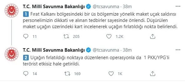 Açıklamada, "Fırat Kalkanı bölgesindeki bir üs bölgemize yönelik maket uçak saldırısı personelimizin dikkati ve alınan tedbirler sayesinde önlendi. Düşürülen maket uçağın üzerindeki kart incelenerek uçağın fırlatıldığı nokta belirlendi. Uçağın fırlatıldığı noktaya düzenlenen operasyonla da 1 PKK/YPG'li terörist etkisiz hale getirildi" denildi.