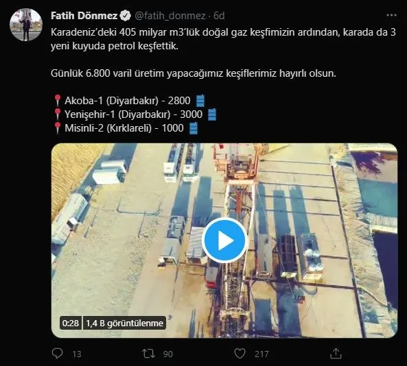 Enerji ve Tabii Kaynaklar Bakanı Fatih Dönmez, sosyal medya hesabından yaptığı paylaşımda, "Karadeniz'deki 405 milyar metreküplük doğal gaz keşfimizin ardından, karada da 3 yeni kuyuda petrol keşfettik.