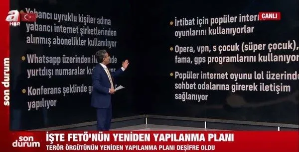 Örgütün elebaşından gelen emir üzerine FETÖ Türkiye'de yeniden yapılanmaya çalışıyor. Örgüt kriptolu mesajlaşma programı ByLock üzerinden yapıyordu ancak şimdi sistemi değiştirdiler. Yabancı uyruklu kişiler adına yabancı internet şirketlerinden alınmış abonelikler üzerinden sağlıyor. WhatsApp üzerinden iletişimde yurt dışı numaralar kullanılıyor. Konferans şeklinde görüşmeler yapılıyor. İrtibat için popüler internet oyunları kullanıyorlar. Opera, VPN, s çocuk fama ve GPS programlarını kullanıyor. Popüler oyunlardan 'LOL' üzerinden sohbet odalarında konuşuyorlar.