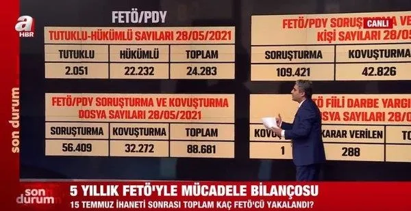 2 bin 51 kişi tutuklandı. Hükümlü sayısı ise 22 bin 232 ve toplamda 24 bin 283. Bu rakamlar İçişleri Bakanlığı'ndan aldığımız güncel rakamlar. 56 bin 409 soruşturma, 32 bin 272 kovuşturma ve toplam 88 bin 681 dosya bulunuyor. Milli Savunma Bakanlığı tarafından yapılan açıklamada 24 bin 714 personelin ihraç edildiği 2 bin 493 personel için ise idari sürecin devam ettiği belirtildi.