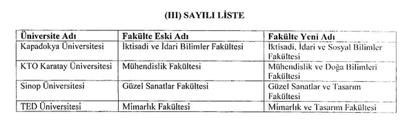 Kapadokya Üniversitesine bağlı İktisadi ve İdari Bilimler Fakültesinin adı İktisadi, İdari ve Sosyal Bilimler Fakültesi, KTO Karatay Üniversitesi Mühendislik Fakültesinin adı Mühendislik ve Doğa Bilimleri Fakültesi, Sinop Üniversitesi Güzel Sanatlar Fakültesinin adı Güzel Sanatlar ve Tasarım Fakültesi ve TED Üniversitesi Mimarlık Fakültesinin adı ise Mimarlık ve Tasarım Fakültesi olarak değiştirildi