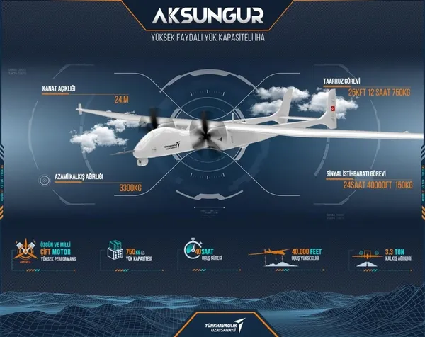 ANKA platformundan yola çıkılarak 18 ay gibi kısa sürede geliştirilen, yüksek faydalı yük kapasitesiyle kesintisiz çok rollü istihbarat, gözetleme, keşif ve taarruz görevleri gerçekleştirme kapasitesine sahip Aksungur İHA, sahip olduğu SATCOM faydalı yüküyle görüş hattı ötesi operasyon esnekliği sağlıyor.
