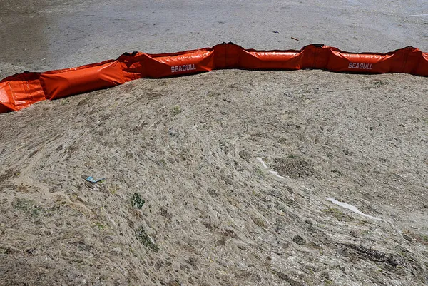Caddebostan Sahili'ne gelen ekipler, akışkan deniz salyasının bir noktada birikmesi için denize bariyer çekti.