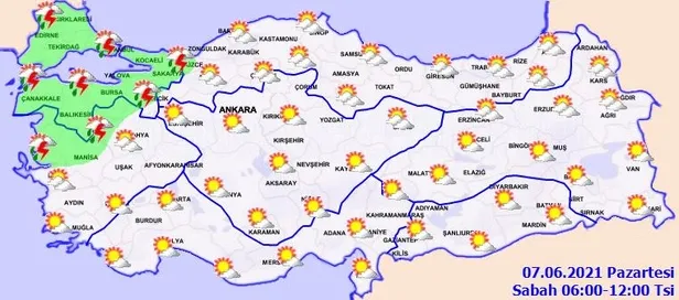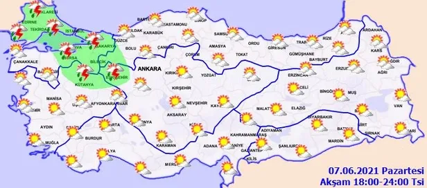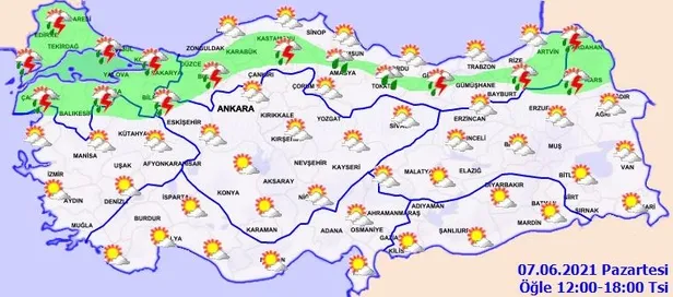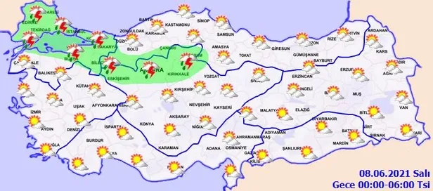 Marmara, İç Ege, Batı Akdeniz'in iç kesimleri, İç Anadolu'nun kuzey ve batısı, Batı ve Orta Karadeniz'in iç kesimleri ile Karaman'ın doğu, Niğde ve Kayseri'nin güney ve doğu, Erzurum'un doğu, Kars'ın güney ve Ağrı'nın batı çevrelerinde sağanak ve yer yer gök gürültülü sağanak öngörülüyor.