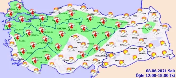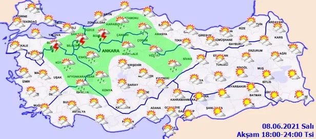 Meteoroloji Genel Müdürlüğü tarafından yapılan son değerlendirmelere göre, ülkemizin kuzey, iç ve batı kesimlerinin parçalı ve çok bulutlu, Marmara, İç Ege, Batı Akdeniz, İç Anadolu'nun kuzey ve batısı, Batı ve Orta Karadeniz'in iç kesimleri, Sinop, Kayseri ve Gümüşhane çevreleri ile Erzurum'un doğu, Kars'ın güney ve Ağrı'nın batı ilçelerinin sağanak ve gök gürültülü sağanak yağışlı, diğer yerlerin az bulutlu ve açık geçeceği tahmin ediliyor.