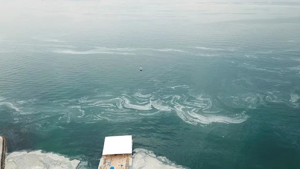 Kadıköy Fenerbahçe Sahili'nde denizin dibini ve yüzeyini kaplayan deniz salyası, yoğunlaşmaya devam ediyor. Son aylarda Marmara Denizi ve çevresinde oluşan denizin dibini ve yüzeyini kaplayan deniz salyası havadan görüntülendi. İstanbul sahillerinde yoğunluğunu artıran deniz salyası, özellikle sabah saatlerinde yoğun bir kokuyu da beraberinde getiriyor. Marmara Denizi'nde sıklıkla görülen ve deniz salyası olarak bilinen müsilaj, sahil şeridinde oluşturduğu tabaka ile korkutucu görüntülere neden oldu.