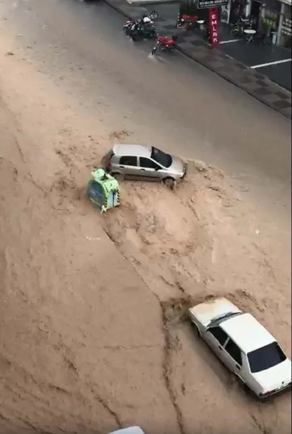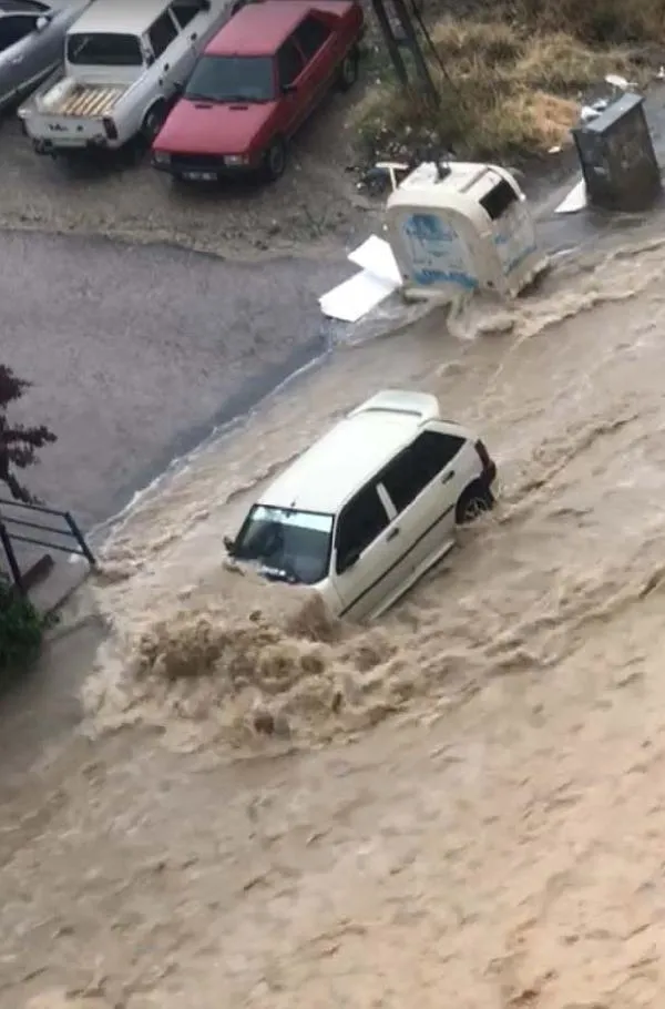 Sel nedeniyle caddede birçok araç sürüklenirken sürücüler zor anlar yaşadı. Bazı sürücüler, araçlarını yol kenarına almaya çalıştı. Sel nedeniyle bazı iş yerlerini de su bastı.