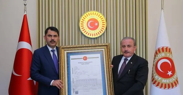 Bakan Kurum Gazi Meclisin tapu senedini Meclis Başkanı Şentop'a takdim etti