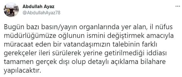 Vali Ayaz Twitter hesabından yapığı paylaşımda "Bugün bazı basın/yayın organlarında yer alan, il nüfus müdürlüğümüze oğlunun ismini değiştirmek amacıyla müracaat eden bir vatandaşımızın talebinin farklı gerekçeler ileri sürülerek yerine getirilmediği iddiası tamamen gerçek dışı olup detaylı açıklama bilahare yapılacaktır." ifadelerine yer verdi.