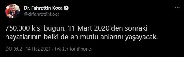Koca, Twitter hesabından yaptığı paylaşımda, Türkiye'de ilk Kovid-19 vakasının görüldüğü 11 Mart 2020'ye atıfta bulunarak, "750 bin kişi bugün, 11 Mart 2020'dn sonraki hayatlarının belki de en mutlu anlarını yaşayacak." ifadelerini kullandı.