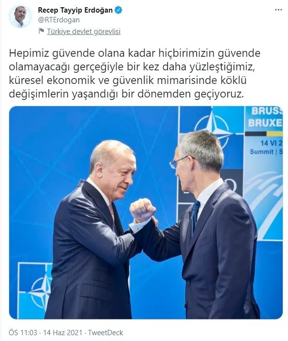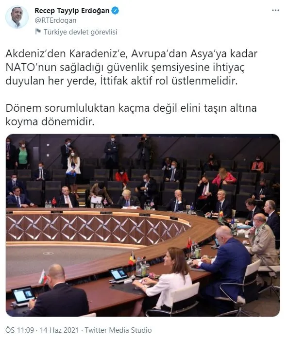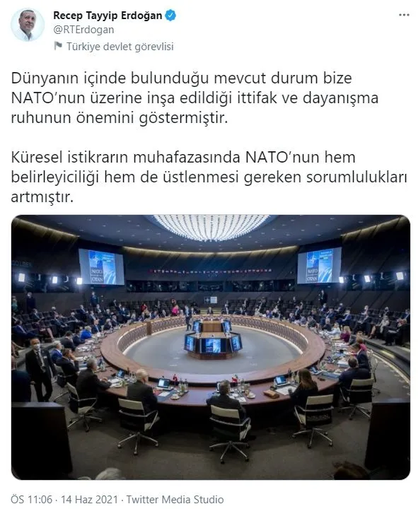 Erdoğan, zirve vesilesiyle Amerika Birleşik Devletleri Başkanı Joe Biden ile az evvel bir araya geldiklerini belirterek, "NATO Brüksel Zirvesi'ni küresel ölçekte kritik hadiselerin yaşandığı işte böyle bir atmosferde gerçekleştirdik. İttifakın önümüzdeki 10 yıllık yol haritasını teşkil edecek NATO 2030 sürecine ilişkin önemli kararların alındığı Zirvemizi tamamladık. Zirve toplantımızda NATO'nun güvenliğine yönelik tehdit ve meydan okumalar hakkında stratejik düzeyde görüş alışverişinde bulunduk." diye konuştu.