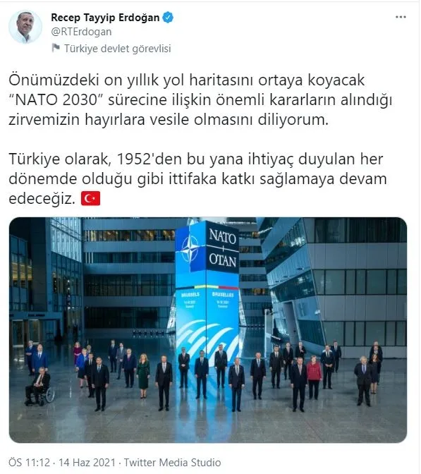 Önümüzdeki on yıllık yol haritasını ortaya koyacak "NATO 2030" sürecine ilişkin önemli kararların alındığı zirvemizin hayırlara vesile olmasını diliyorum. Türkiye olarak, 1952'den bu yana ihtiyaç duyulan her dönemde olduğu gibi ittifaka katkı sağlamaya devam edeceğiz.