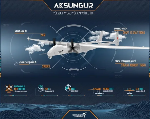 Türkiye'nin ürettiği yerli ve milli İHA ve SİHA'lar dünyayı kendine hayran bırakıyor. Türk Havacılık ve Uzay Sanayii (TUSAŞ) tarafından geliştirilen AKSUNGUR, Ankara TUSAŞ tesislerinden Adana Şakirpaşa Havaalanı'na uçarak ilk saha görevine başladı.