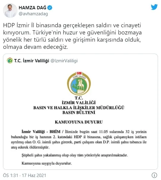 AK Parti Genel Başkan Yardımcısı Hamza Dağ "HDP İzmir İl binasında gerçekleşen saldırı ve cinayeti kınıyorum. Türkiye'nin huzur ve güvenliğini bozmaya yönelik her türlü saldırı ve girişimin karşısında olduk, olmaya devam edeceğiz." mesajını paylaştı.