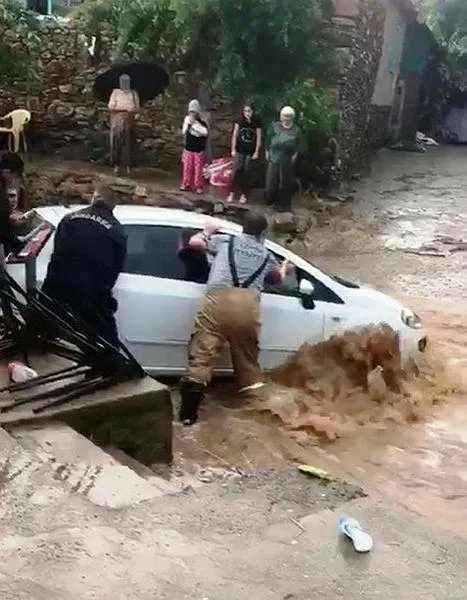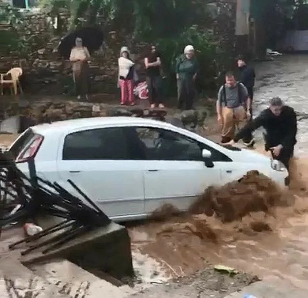 Bir mahallede ise otomobilin sürüklenme anları kameraya yansıdı. Sel suları arasında kalan otomobil ve sürücüsü, görevliler tarafından güçlükle kurtarıldı.