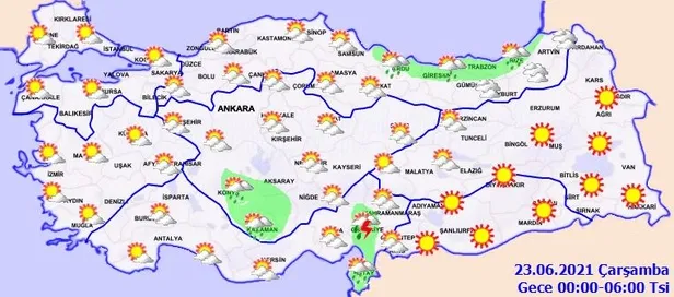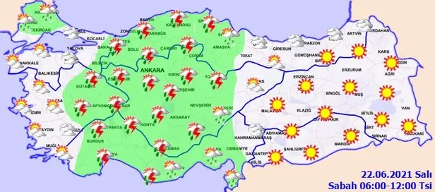 Meteoroloji Genel Müdürlüğünden son dakika hava durumu uyarılar gelmeye devam ediyor. Yapılan son değerlendirmelere göre, İç Anadolu (Kayseri ve Sivas dışında), Batı Karadeniz’in iç kesimleri ile Isparta, Afyonkarahisar ve Kütahya çevrelerinde yerel olmak üzere kuvvetli olması beklendiğinden su baskını, yıldırım, dolu yağışı, yağış anında kuvvetli rüzgar, ulaşımda aksamalar gibi olumsuzluklara karşı dikkatli ve tedbirli olunmalıdır. Peki, İstanbul, Ankara ve İzmir'de hava nasıl olacak? İşte 22 Haziran il il hava durumu raporu.