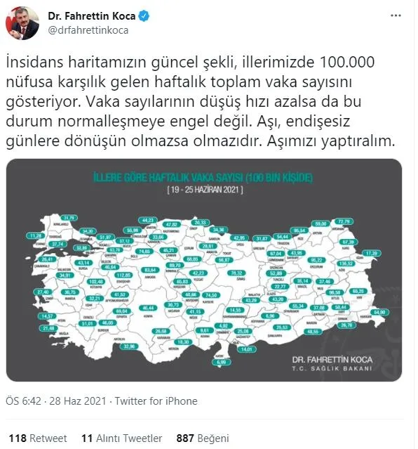 Koca, "İnsidans haritamızın güncel şekli, illerimizde 100.000 nüfusa karşılık gelen haftalık toplam vaka sayısını gösteriyor. Vaka sayılarının düşüş hızı azalsa da bu durum normalleşmeye engel değil. Aşı, endişesiz günlere dönüşün olmazsa olmazıdır. Aşımızı yaptıralım" dedi.