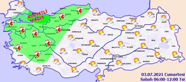 Meteoroloji Genel Müdürlüğü, İstanbul Valiliği ve AFAD'dan peş peşe sağanak yağış uyarısı geldi. Cumartesi sabahı ilk saatlerden itibaren dikkat çekilen uyarıda, "Sel, su baskını, yıldırım, ulaşımda aksamalar, yağış anında kuvvetli rüzgâr, küçük çaplı dolu yağışı gibi olumsuzluklara karşı dikkatli ve tedbirli olunmalıdır" açıklaması yapıldı. Anadolu Yakasındaki bazı ilçelerde sabah saatlerinde yağmur yağdı. İşte 3 Temmuz il il hava durumu raporu.
