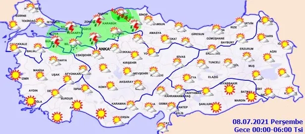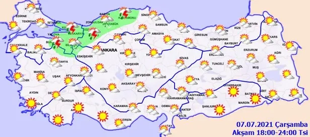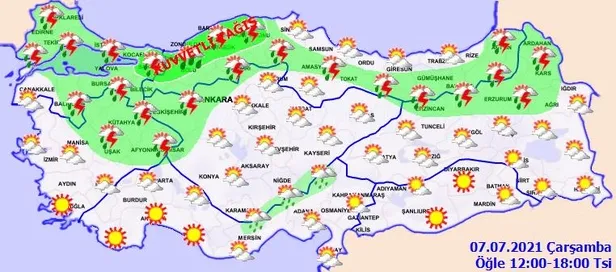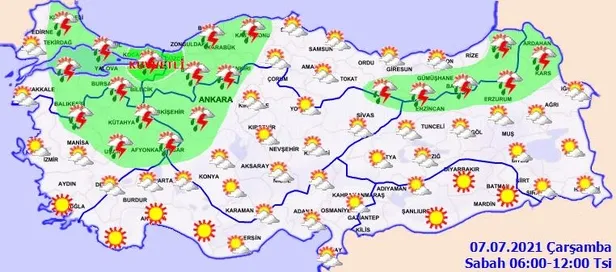 İstanbul'da Temmuz ayında etkili olan gök gürültülü sağanak yağışlar sonrası Meteoroloji Genel Müdürlüğünden peş peşe uyarılar gelmeye devam ediyor. Yapılan son değerlendirmelere göre, Batı Karadeniz (Sinop hariç) ile Kocaeli ve Sakarya çevrelerinde yerel olarak kuvvetli olması beklendiğinden ani sel, su baskını, yıldırım, yerel dolu yağışı, ulaşımda aksamalar, yağış anında kuvvetli rüzgar gibi olumsuzluklara karşı dikkatli ve tedbirli olunması gerektiği bildirildi. İstanbul'da ise aralıklı ve yerel olmak üzere sağanak ve yer yer gök gürültülü sağanak yağış bekleniyor. İşte il il 7 Temmuz hava durumu raporu.