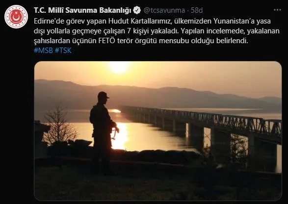 Bakanlığın Twitter hesabından yapılan açıklamada, "Edirne'de görev yapan hudut kartallarımız, ülkemizden Yunanistan'a yasa dışı yollarla geçmeye çalışan 7 kişiyi yakaladı. Yapılan incelemede, yakalanan şahıslardan üçünün FETÖ terör örgütü mensubu olduğu belirlendi" denildi.