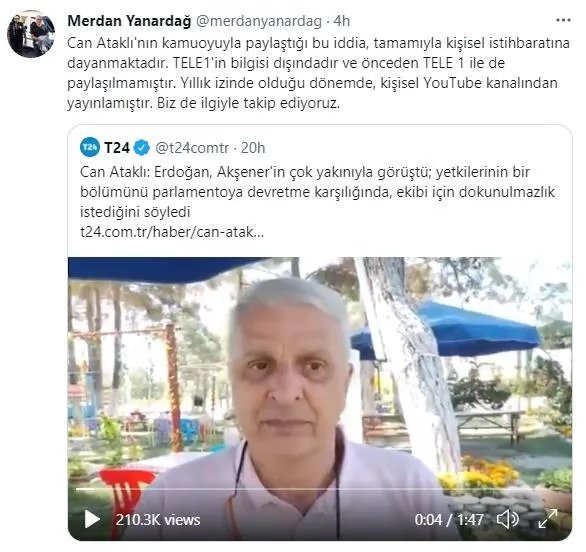"Can Ataklı'nın kamuoyuyla paylaştığı bu iddia, tamamıyla kişisel istihbaratına dayanmaktadır. TELE1'in bilgisi dışındadır ve önceden TELE 1 ile de paylaşılmamıştır. Yıllık izinde olduğu dönemde, kişisel YouTube kanalından yayınlamıştır. Biz de ilgiyle takip ediyoruz."