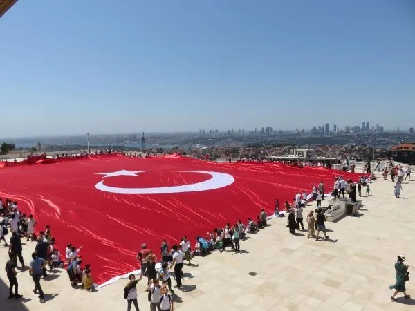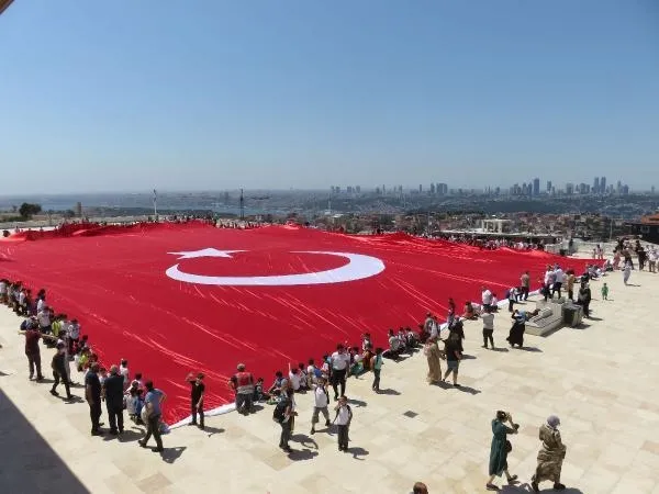 15 Temmuz Demokrasi ve Milli Birlik Günü çerçevesinde, Çamlıca Camii avlusunda 350 öğrencinin 2 bin 71 metrekarelik Türk bayrağı açtı. Camiye gelenler bu anları cep telefonu kameralarıyla kaydetti.